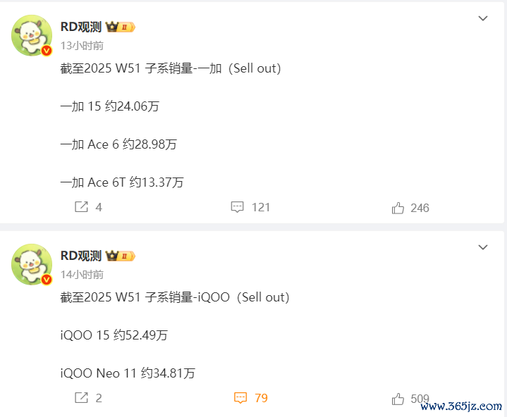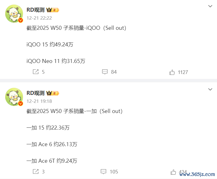 这不在12月29日行业人士“RD观测”就给出了iQOO与一加新机型的销量数据。数据显示截止W31周iQOO 15的销量达到52.49万台,iQOO Neo11的销量达到34.81万台。一加 15的销量为24.06万台,一加Ace 6的销量为28.98万台,一加Ace 6T的销量为13.37万台。iQOO两台机型合讲达到87.3万台,一加三款机型合计达到66.41万台。看到了吗?同样以15命名,iQOO 15现在的是一加15销量的两倍多,且一加Ace6 也是没有卖过同档次的iQOO Neo11。一加Ace6T算是一款最新机型,这个是开售两周的数据。